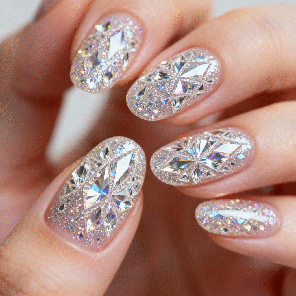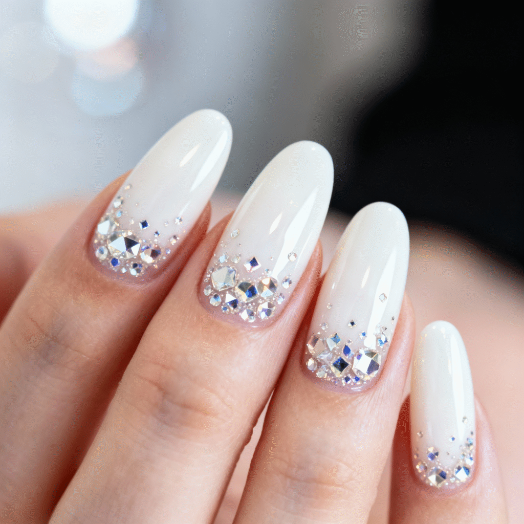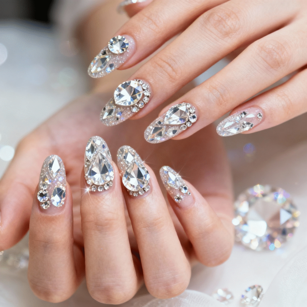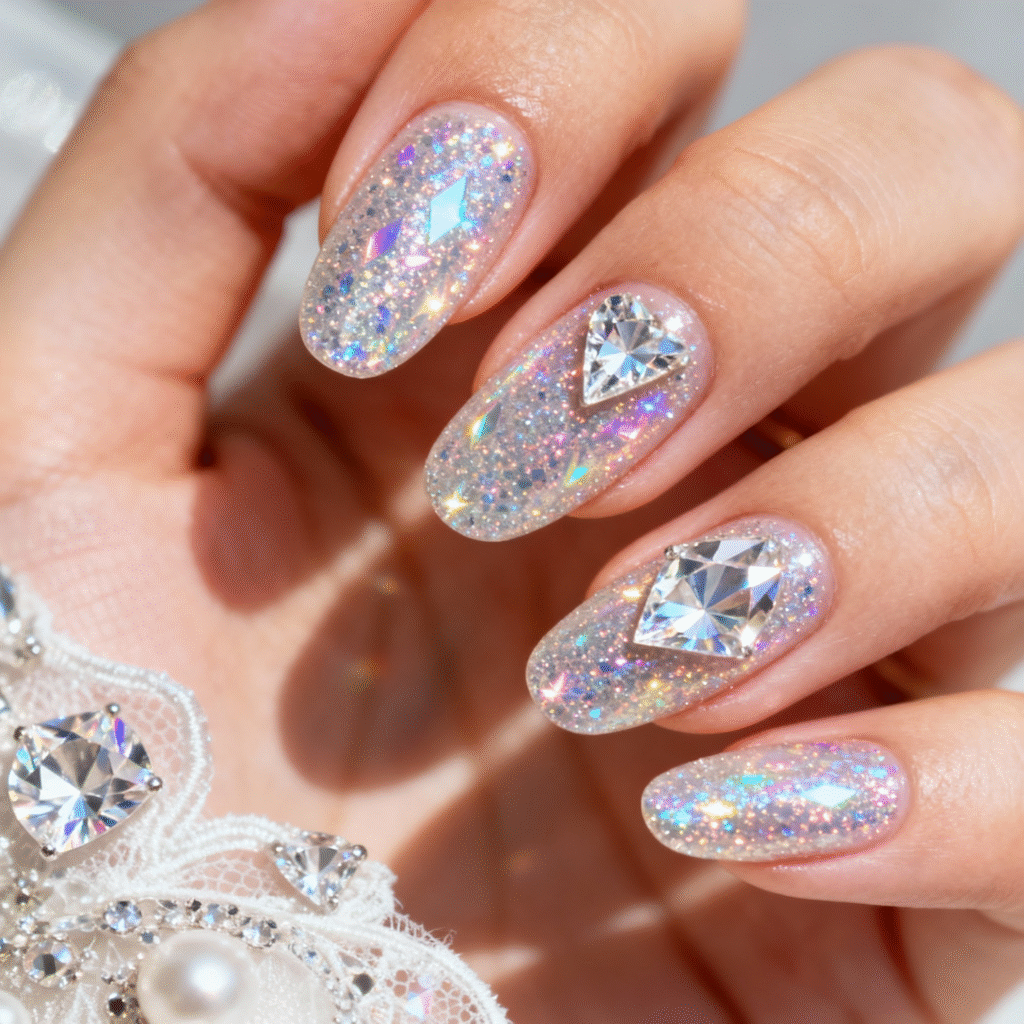 Instead of covering the whole nail with gems, this design focuses detail near the base, creating a refined, jewelry-like accent. It’s subtle enough for daytime yet dazzling under wedding lights.