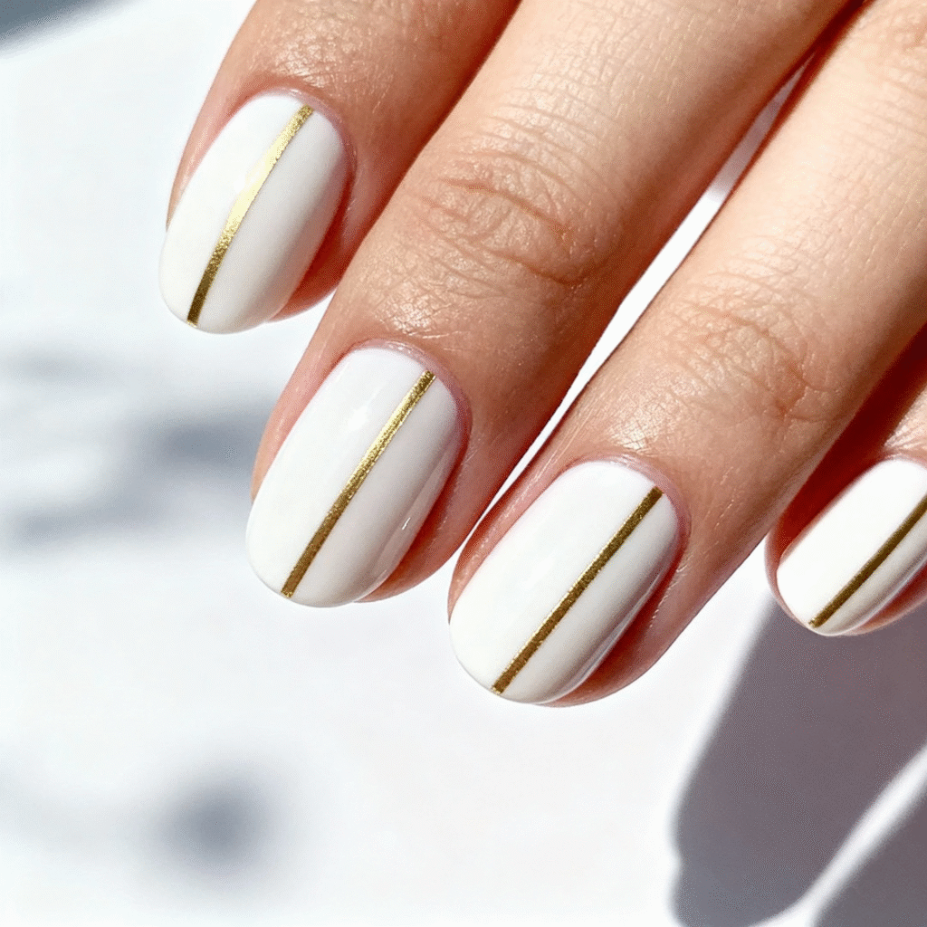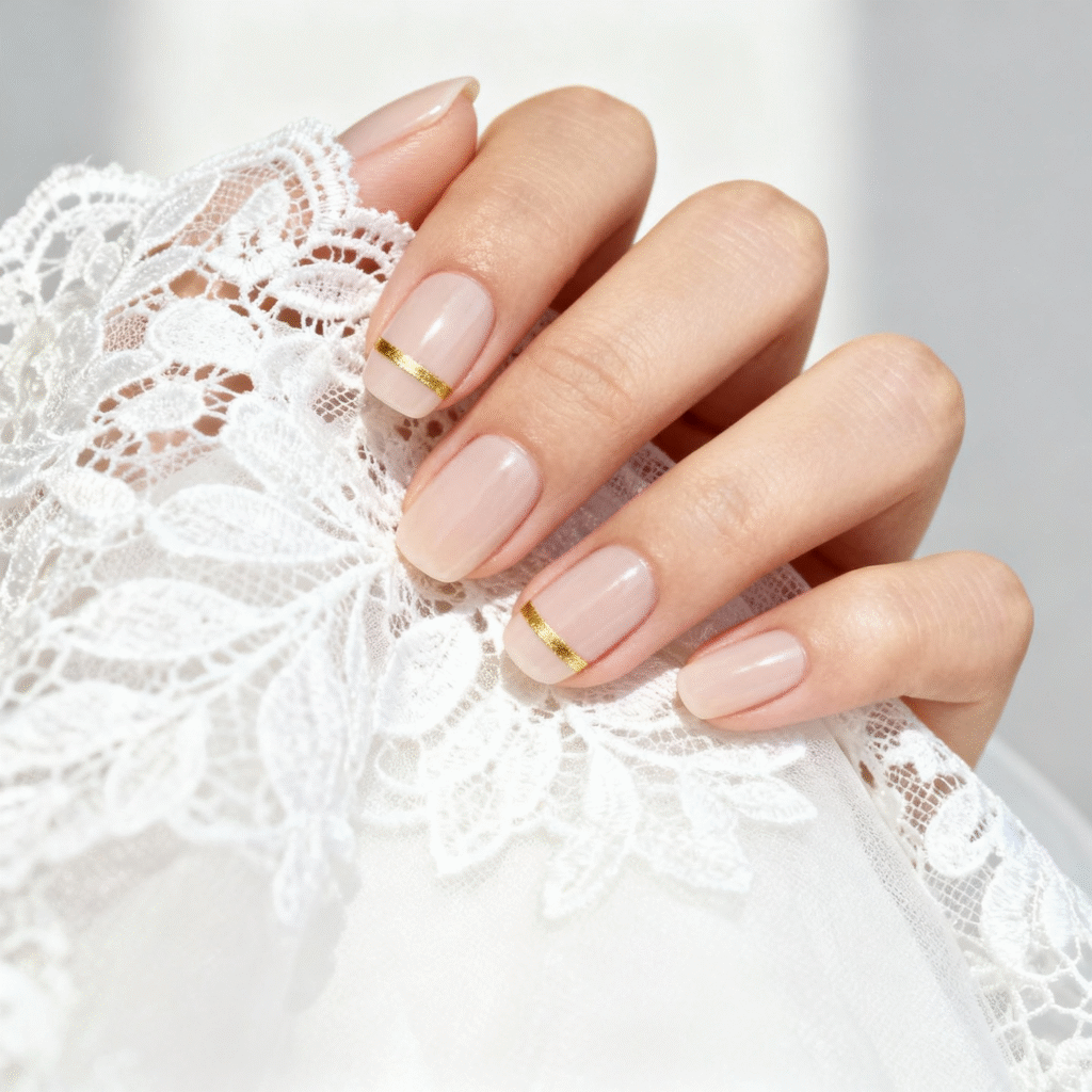 Minimalist gold line nails feature a nude or white base accented by a single thin gold stripe. This chic design suits brides who adore simplicity with a modern luxury twist.