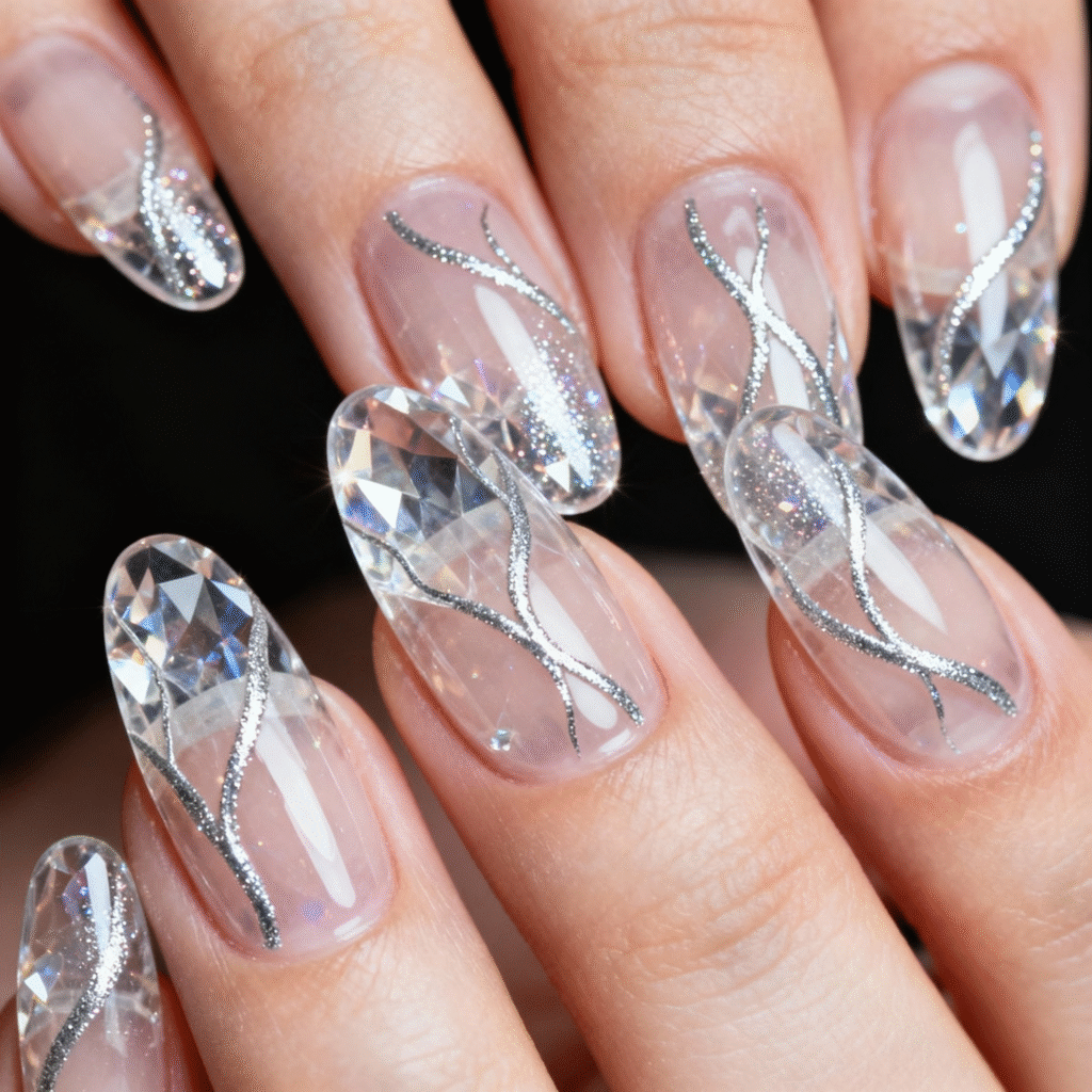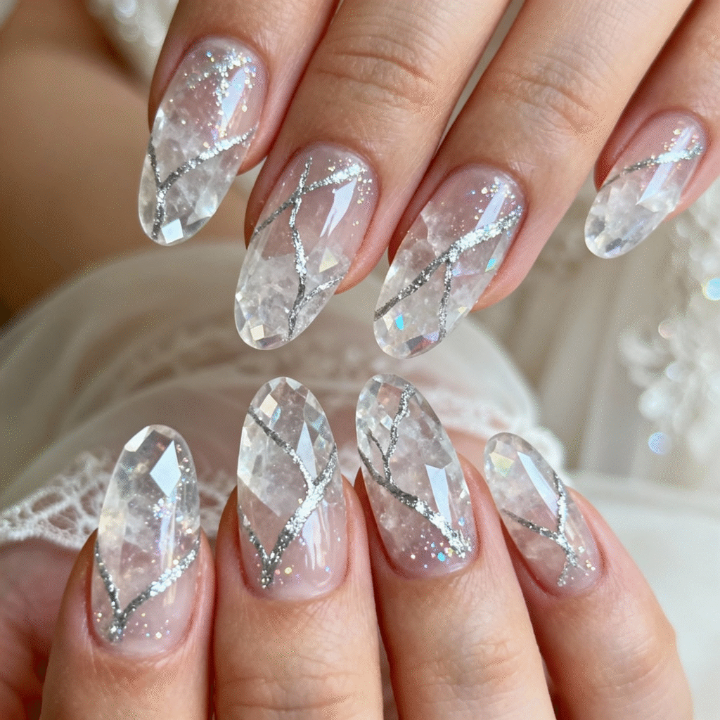 Transparent nails with silver glitter veins give the illusion of crystal quartz. This ethereal design brings a unique, magical glow to bridal manicures.