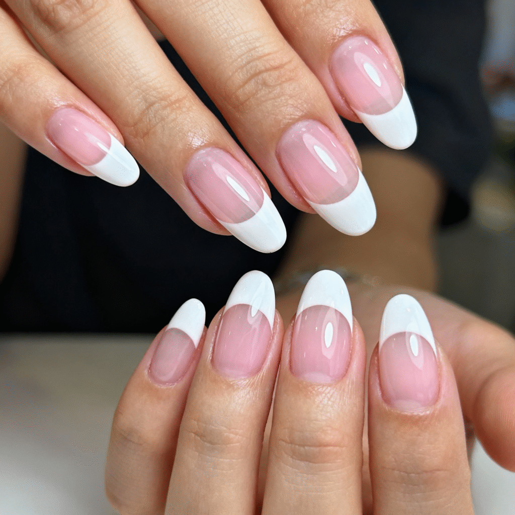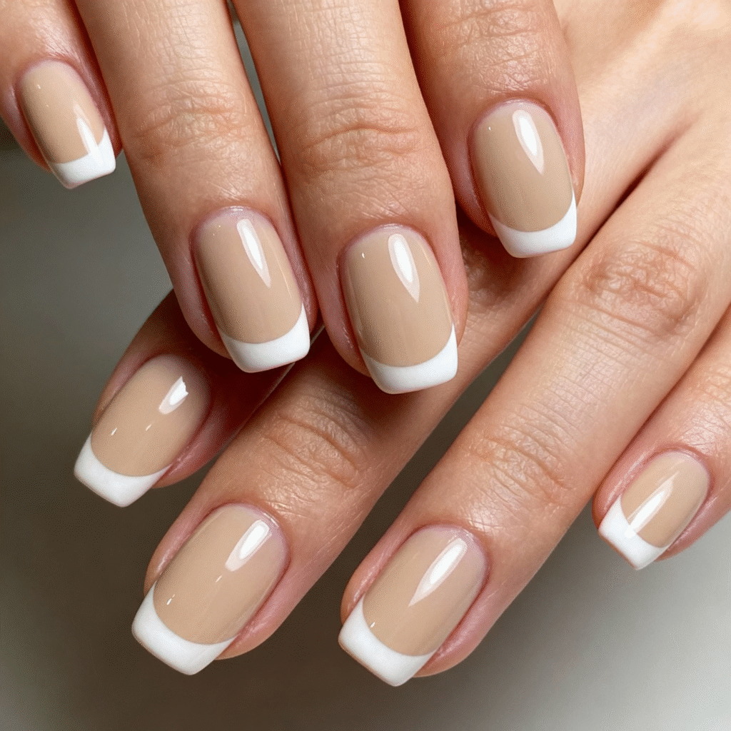 A modern variation of the French manicure, beige nails with crisp white tips create a soft, neutral look that enhances the natural beauty of the hands.