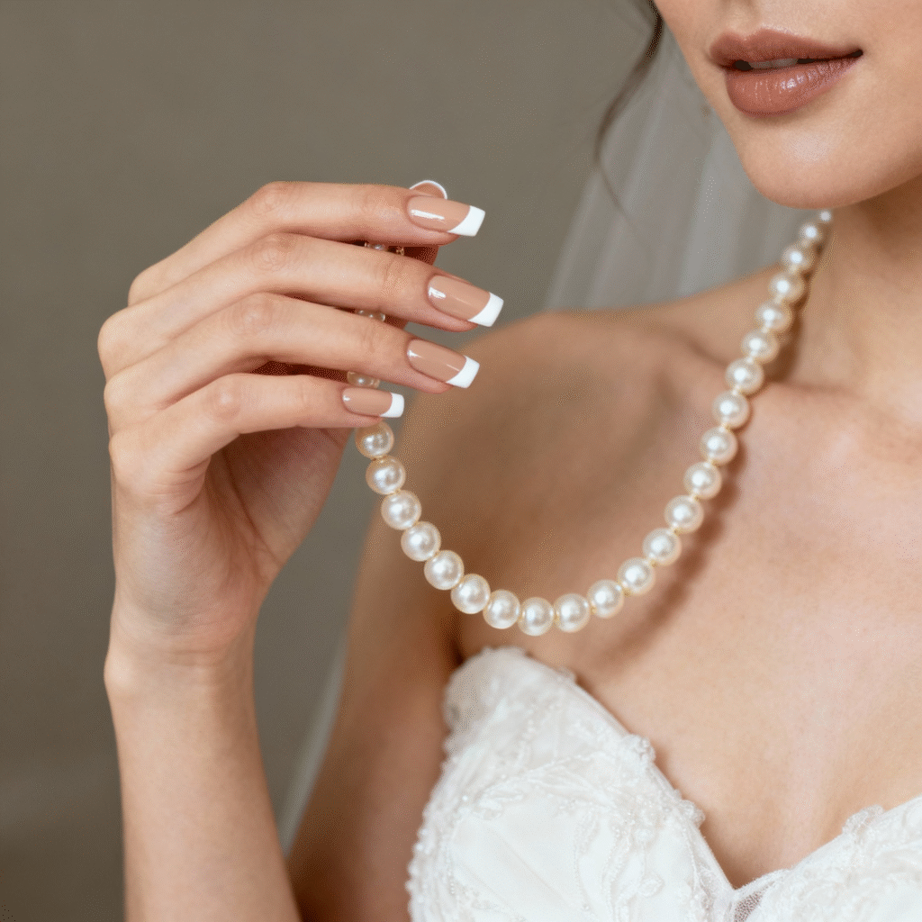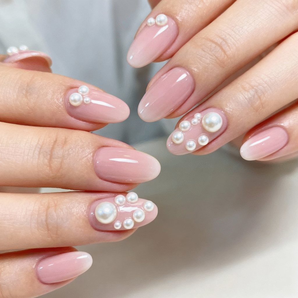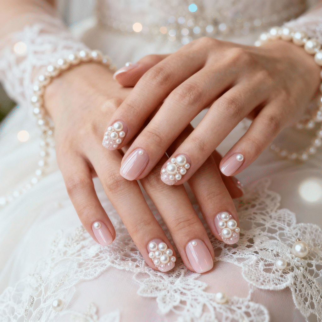 Pearl nails bring sophistication and a vintage bridal charm. Tiny pearls are delicately placed on a nude or pastel base, creating a soft, luminous effect. This design adds luxury and pairs beautifully with pearl jewelry or lace wedding gowns.
