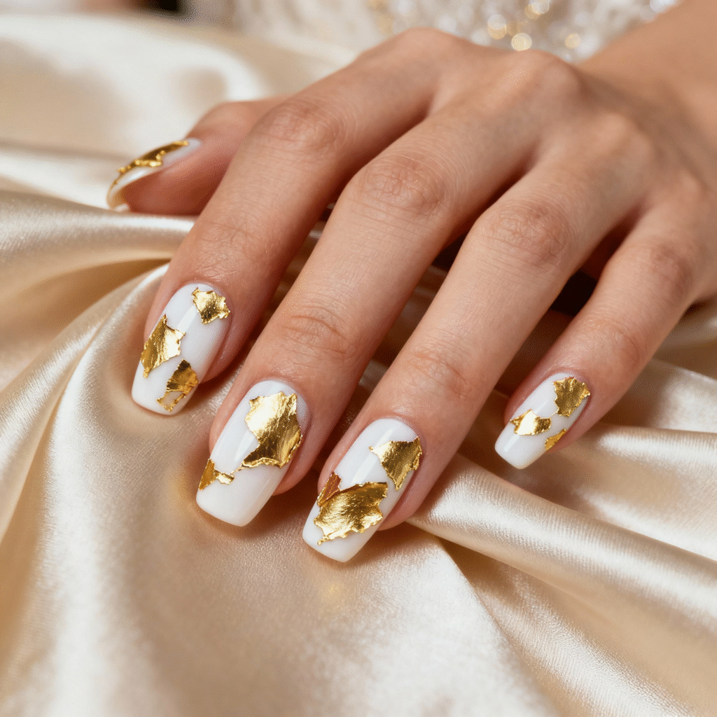 Each nail becomes a piece of abstract art. The random gold leaf placement ensures that every nail looks one-of-a-kind, making it ideal for brides who love luxury with individuality.