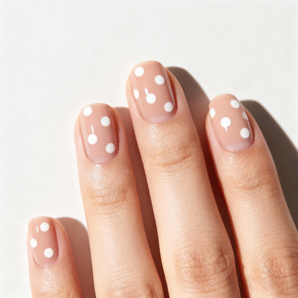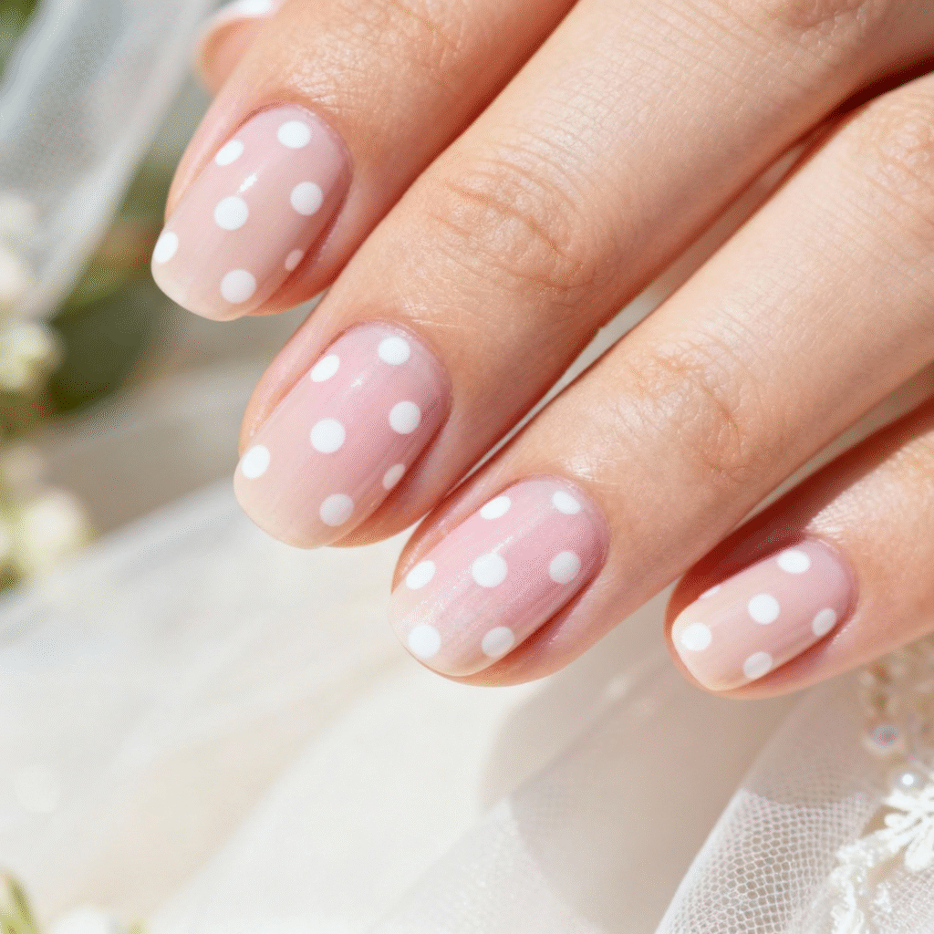 Cute yet elegant, nude nails with white polka dots bring playful charm to the bridal aesthetic. The soft design feels fresh, minimal, and easy to match with any gown.