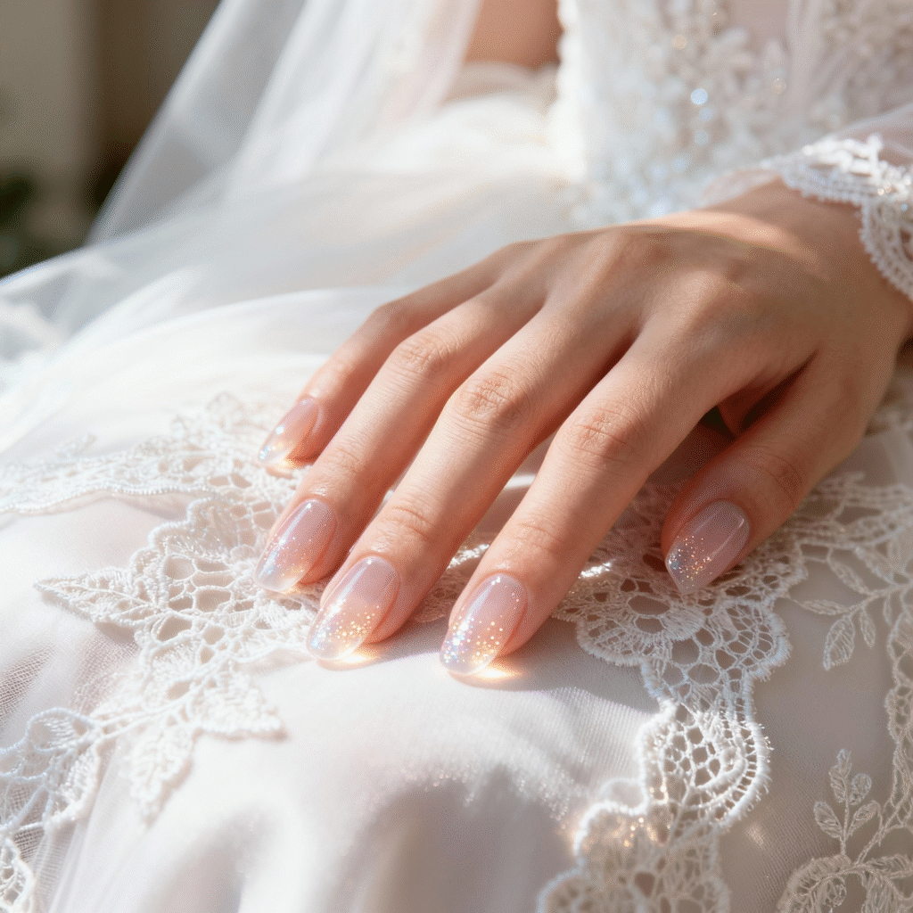 Sheer glitter gradient nails transition from clear or nude bases into soft glittery tips. The subtle sparkle gives an ethereal, floating effect ideal for brides who want understated shimmer.