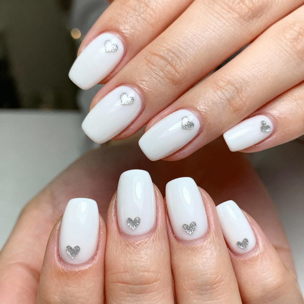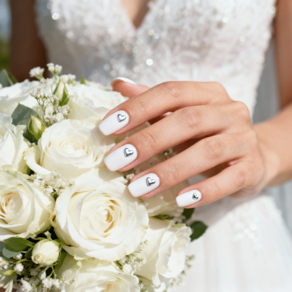 White nails decorated with tiny silver hearts are the epitome of bridal romance. This design is delicate, sweet, and symbolic—perfect for expressing love through minimalist nail art.
