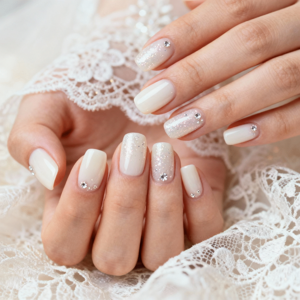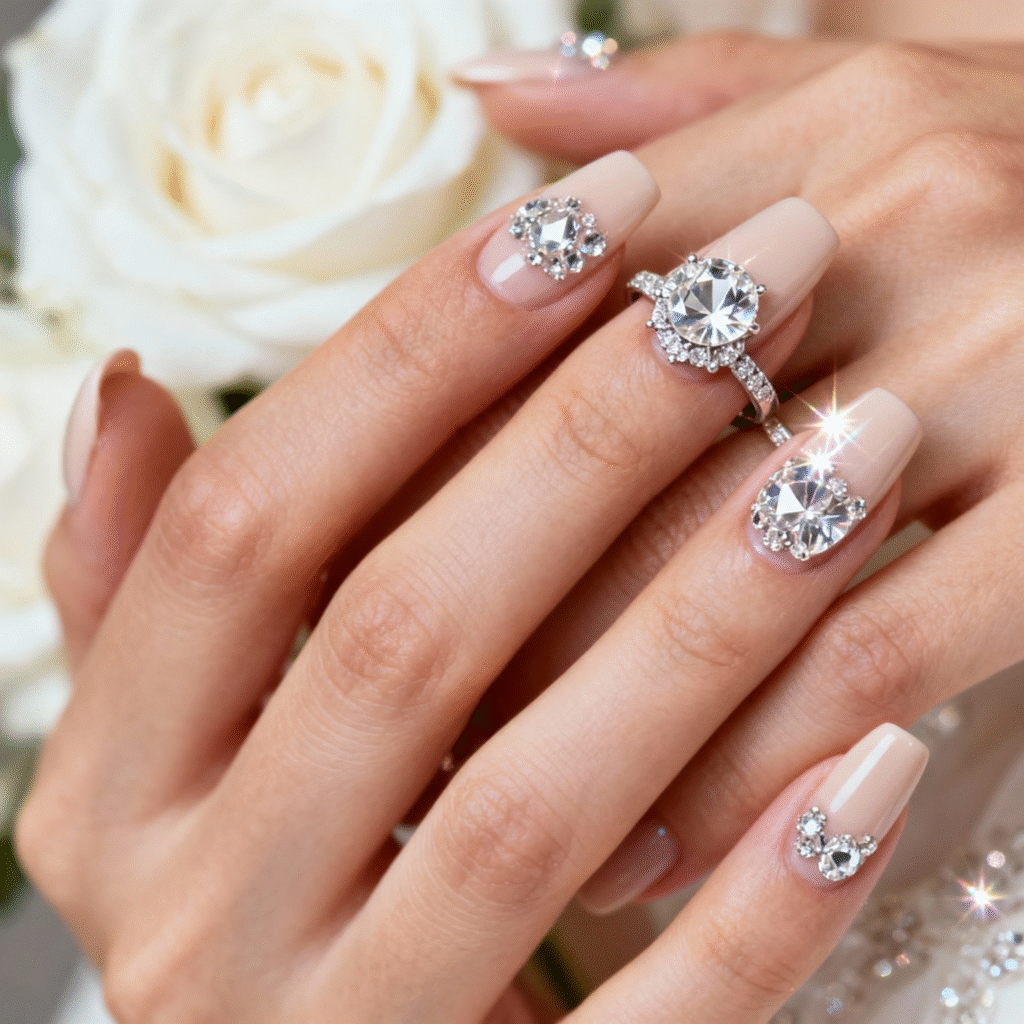 For brides who love a touch of sparkle, crystal accent nails add the perfect dose of glam. One or two feature nails are adorned with rhinestones or Swarovski crystals, while the rest stay in neutral tones for balance.