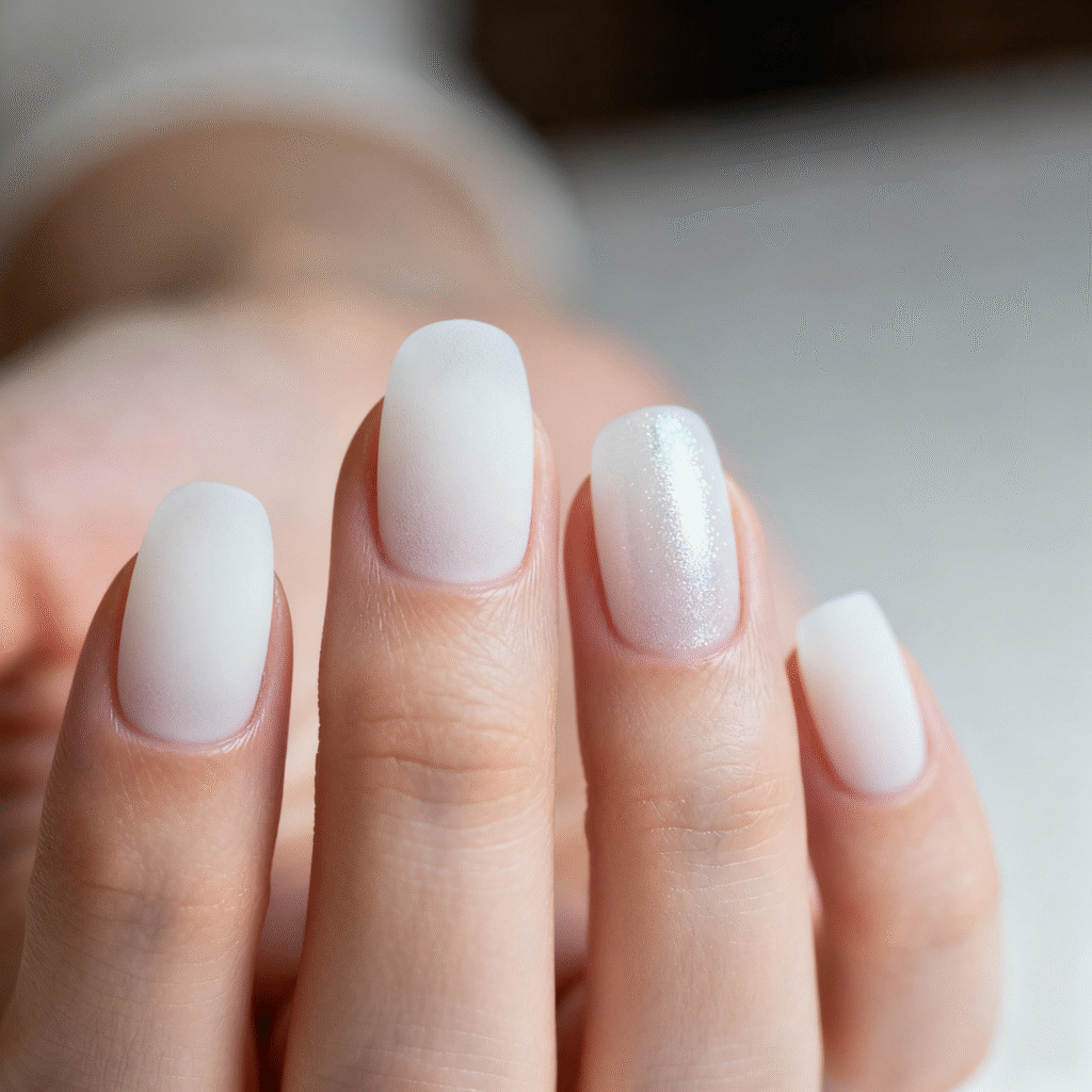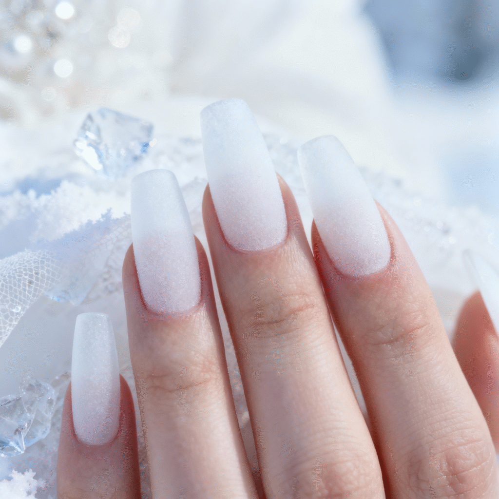 Frosted white nails bring the look of icy elegance to the bridal aesthetic. The semi-matte finish reflects soft light beautifully, evoking wintery charm while staying minimal and timeless.