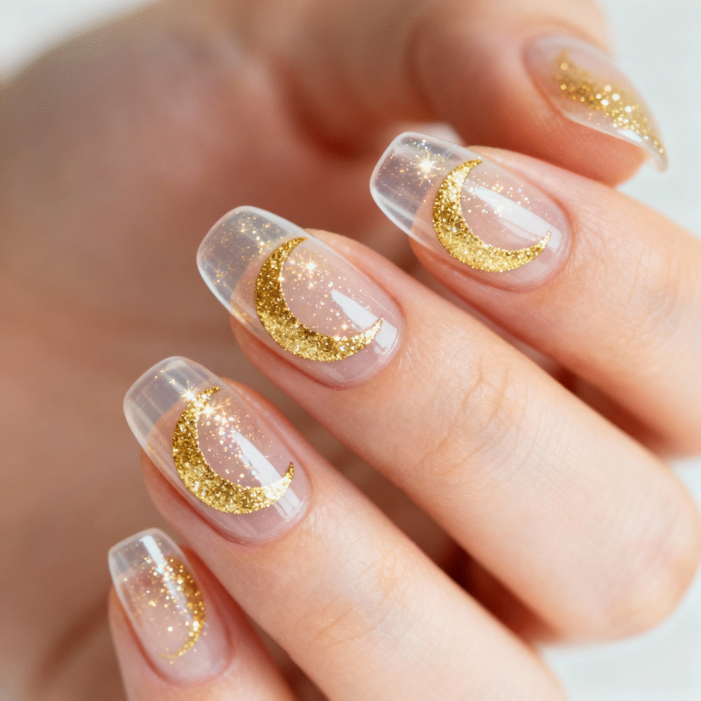 - Use gold glitter polish or decals to form small crescent moons near the cuticles.