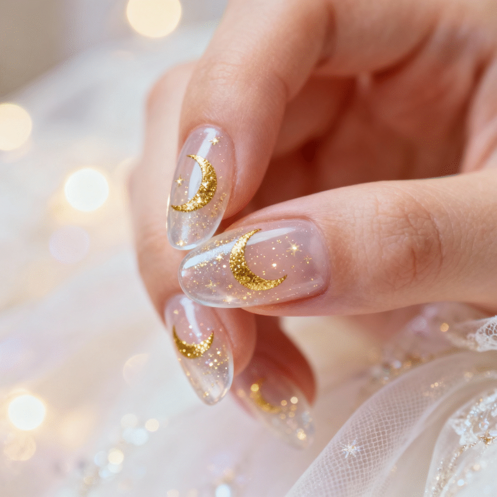 This celestial-inspired design uses clear polish as the base, decorated with tiny crescent moon shapes made of gold glitter. The result is magical and radiant—perfect for brides who want a mystical or modern fairytale vibe.