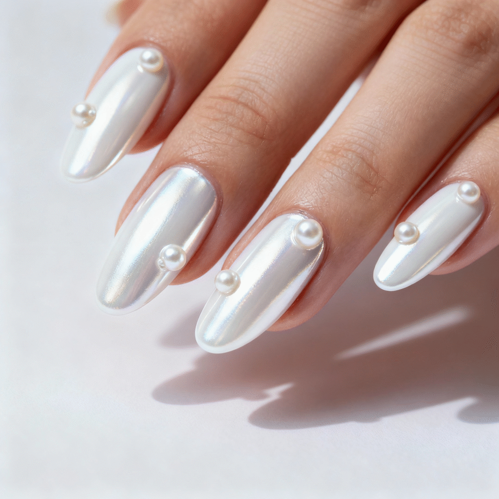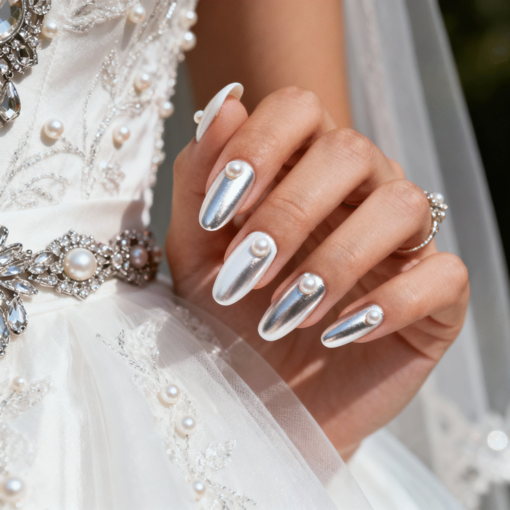 White chrome nails radiate futuristic bridal elegance. Adding small pearls enhances their sophistication, combining modern shimmer with timeless romance. This design suits both minimalist and glam bridal aesthetics perfectly.