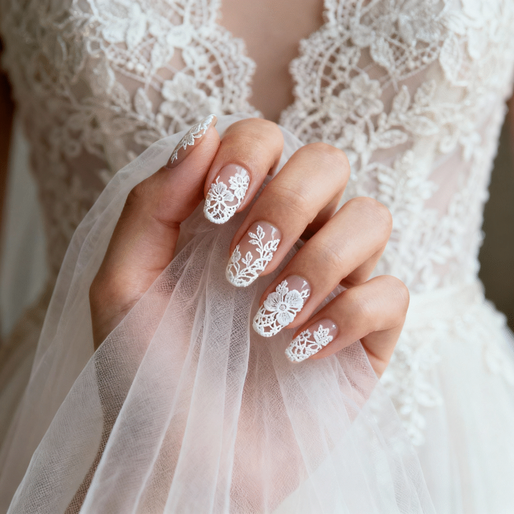 Inspired by wedding dresses, lace nails feature delicate white patterns on sheer or nude bases. The intricate design mimics fine bridal lace, adding an ultra-feminine touch to your look. Perfect for brides who love romantic and detailed art.