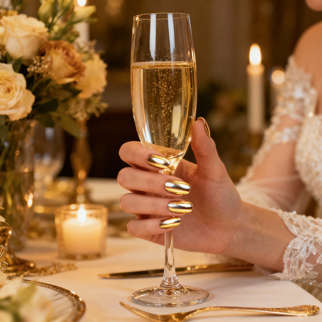Champagne chrome nails bring a metallic yet sophisticated glow to your wedding day look. The smooth, mirror-like finish catches the light and adds a subtle golden radiance, perfect for evening receptions or glamorous venues.