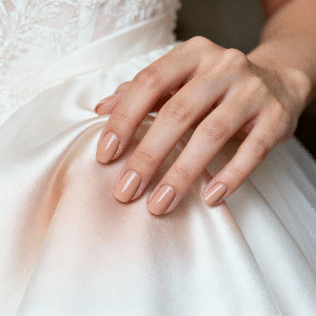 The beige base adds warmth compared to traditional pink tones, complementing all skin shades beautifully. It’s understated yet refined, ideal for brides who appreciate clean, timeless elegance.