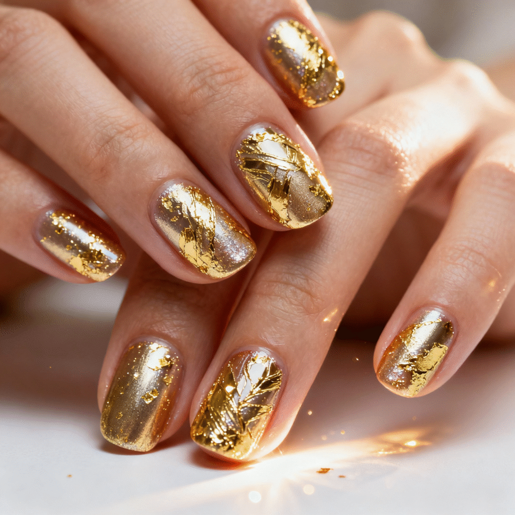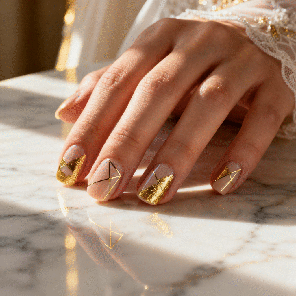 Gold foil nails add a regal, modern touch to wedding manicures. Small pieces of gold foil are applied over neutral or blush bases, creating an abstract yet sophisticated design that gleams under any lighting.