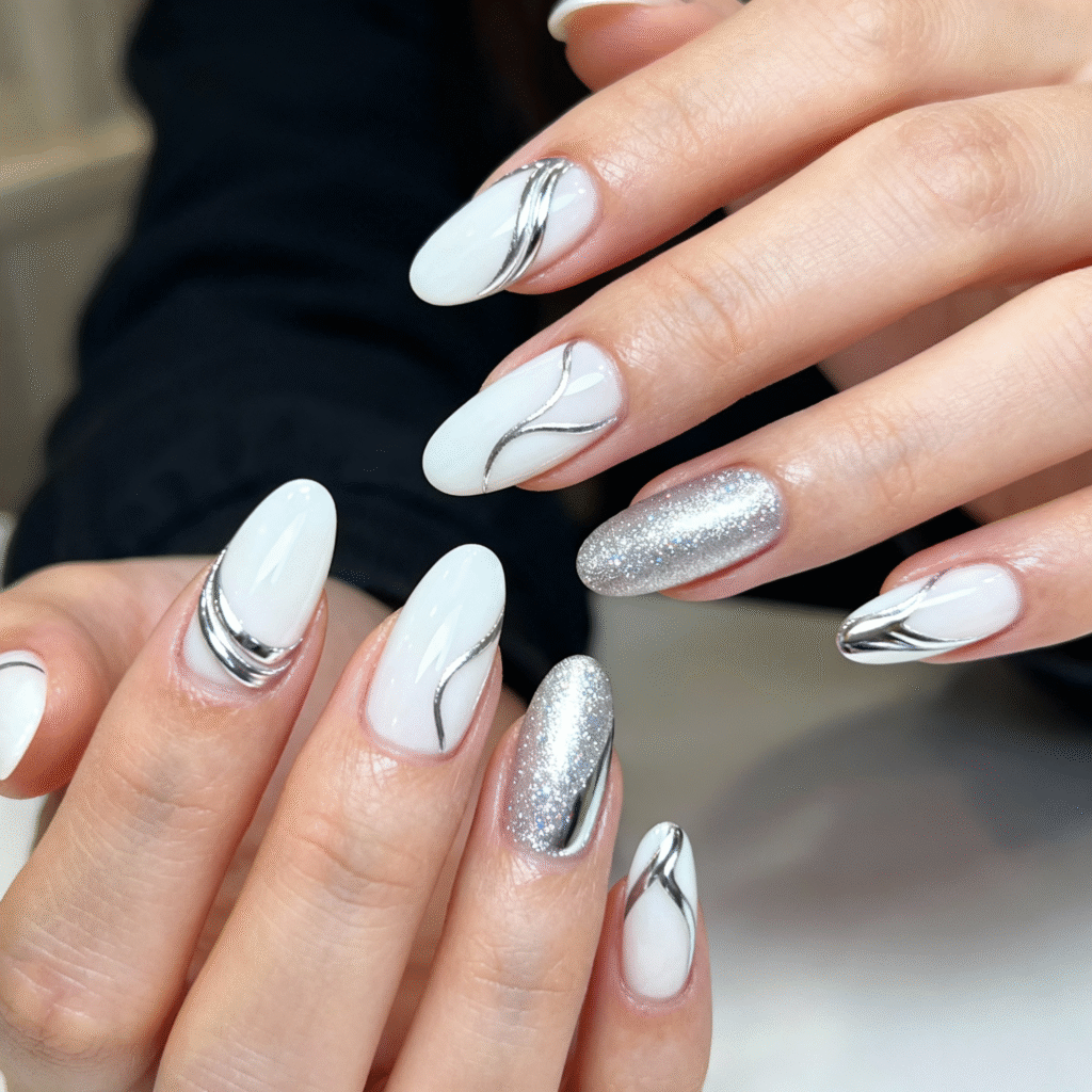 The combination of soft white and metallic silver creates a fresh, futuristic bridal vibe. The linear detailing adds structure and elegance, making your nails look professionally polished and contemporary.