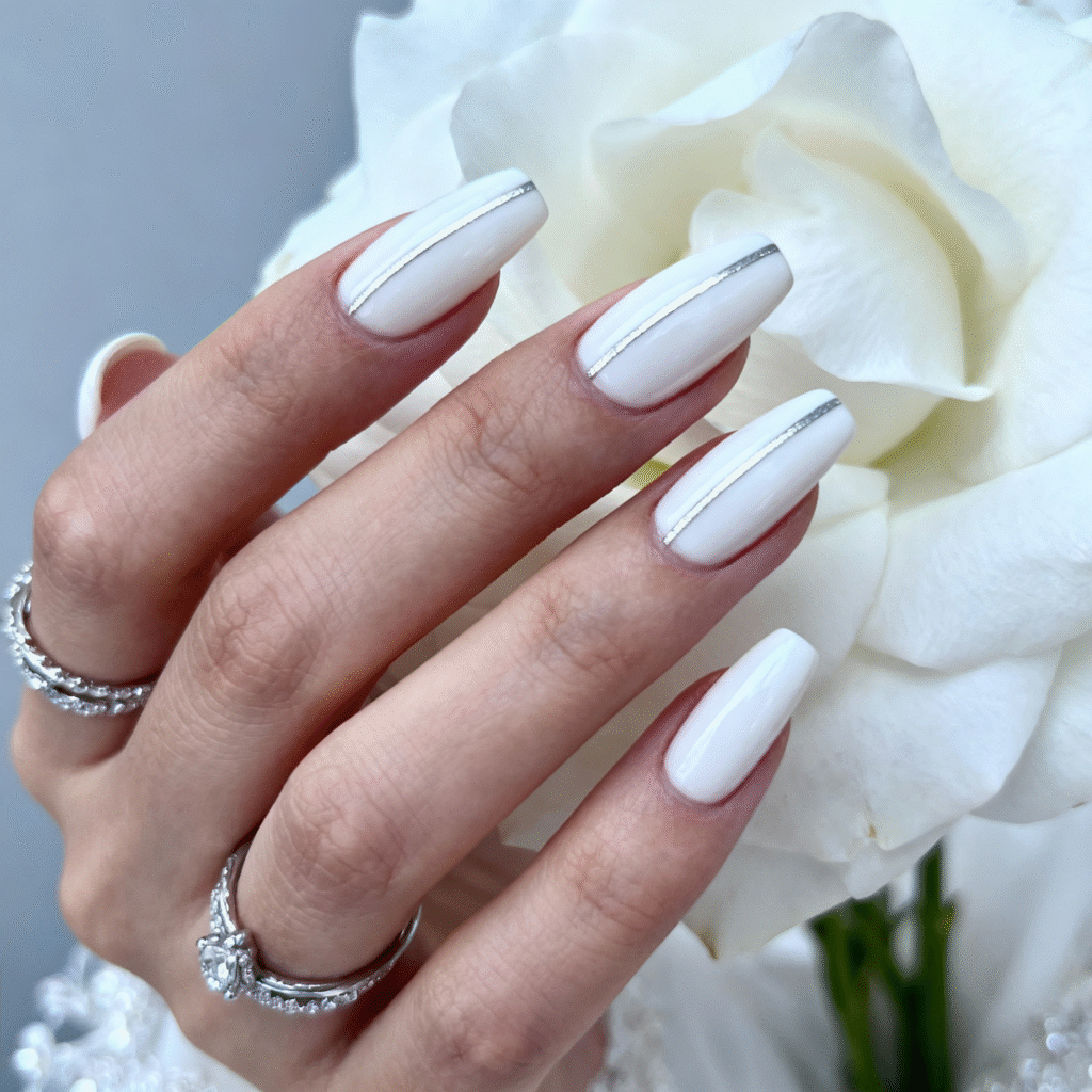 This chic bridal nail design uses milky white polish paired with thin silver lines for a modern, minimalist aesthetic. It’s perfect for brides who prefer sleek, refined beauty without excessive sparkle.