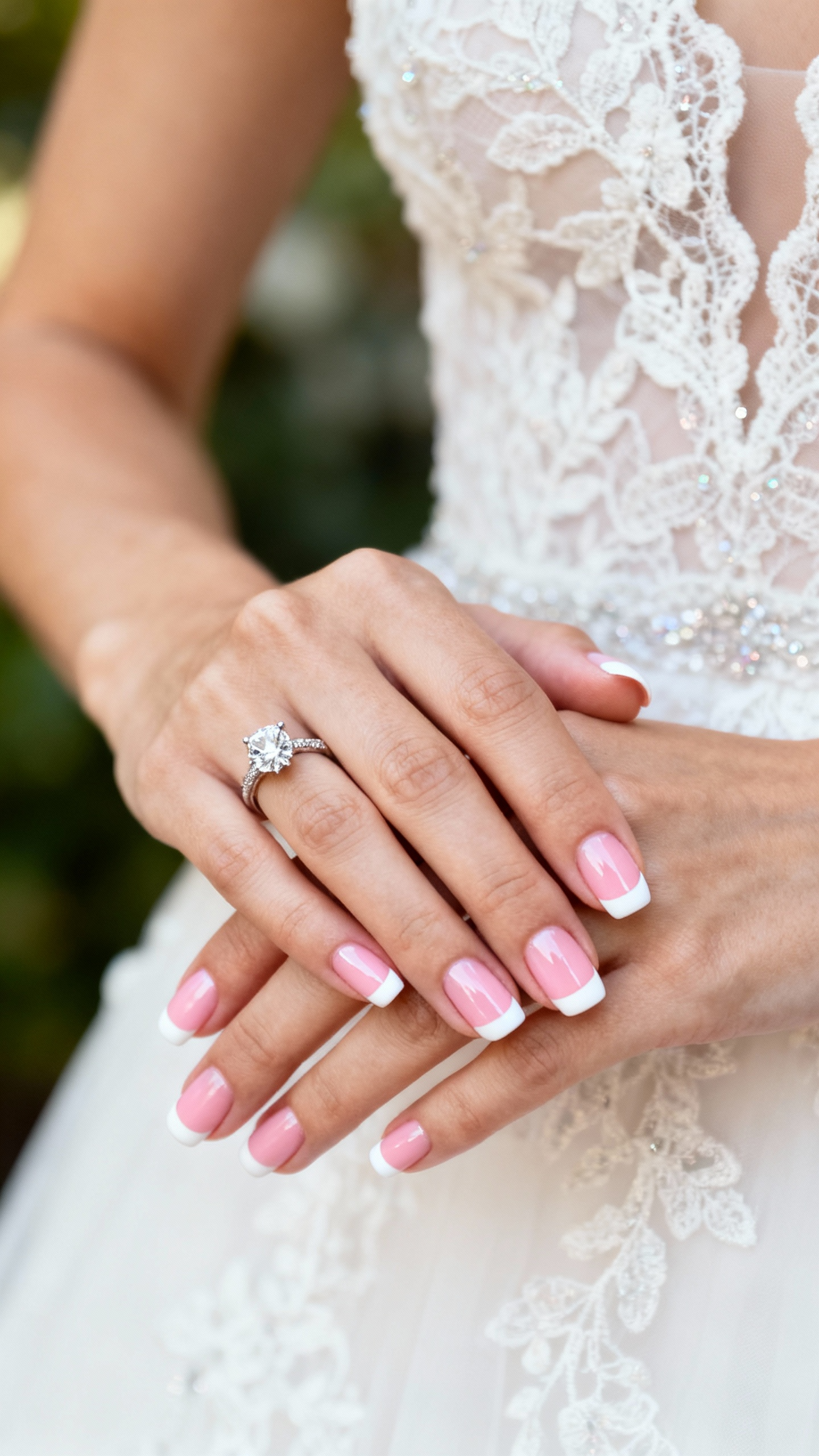 The timeless French manicure remains a top choice for brides who love understated elegance. Featuring soft pink or nude bases with crisp white tips, this design complements any wedding dress and adds a touch of sophistication without overpowering the look. Perfect for brides seeking a clean, graceful appearance.